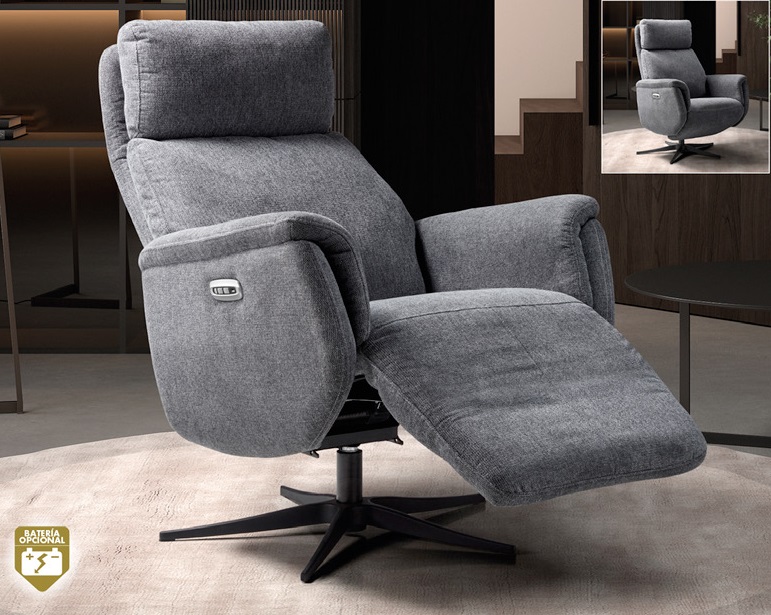 Sillón Elche giratorio y relax eléctrico con dos motores. Tapizado en tela gris claro o gris oscuro (100% poliéster).
